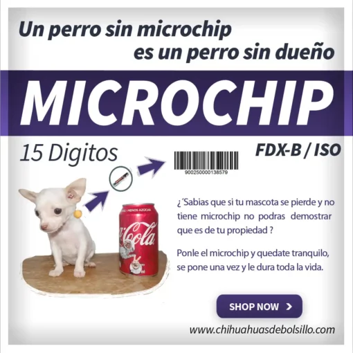 - Este microchip cumple la Norma Europea, es de 15 dígitos y lo leen sin problemas los scanners de los aeropuertos europeos. Perros y gatos lo deben tener implantado para poder viajar a este destino. Más pequeño que un grano de arroz para ser usado en razas pequeñas, como por ejemplo el chihuahua de bolsillo.